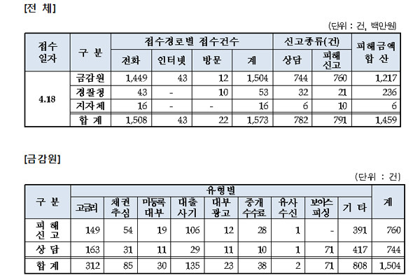 총리실에 따르면 19일에 접수된 불법사금융 피해 신고 및 상담은 총 1,573건으로 피해 상담이 782건, 실제 피해신고가 791건으로 나타났다.