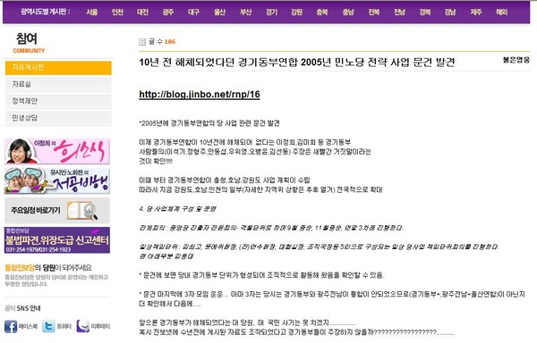 아이디 ‘붉은영웅’은 자유게시판에 글을 올리면서 2005년 3월 13일 진보진영 블로그 ‘진보넷’에 게시된 ‘경기동부연합 민노당 사업 방침’이라는 제목의 문건 주소를 링크했다.