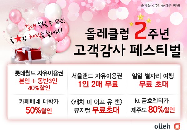 KT는 10일 올레클럽 2주년을 맞아 '별헤는 밤' 등 가족, 연인, 친구와 함께 특별한 추억을 만들 수 있는 다양한 이벤트를 진행한다고 밝혔다.