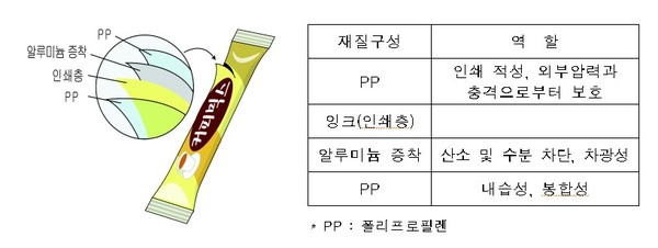 커피믹스나 과자 등의 봉지는 눈으로 보기에는 한 겹으로 된 필름처럼 보인다.하지만 실제로는 산소, 수분, 빛 등 외부 환경으로부터 내용물을 보호하기 위해 폴리프로필렌(PP), 폴리에틸렌(PE), 폴리아미드(PA), 폴리에틸렌테레프탈레이트(PET), 알루미늄박 등 2∼3겹 이상의 필름을 합쳐서 만든 다층포장재를 사용한다.