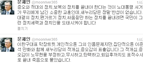문재인 상임고문은 자신의 트위터에 "이한구 (원내)대표의 막장트윗. 개인적으론 그의 인품문제지만 집단적으로는 새누리당의 적개심과 증오감의 표출"이라고 적었다. 그는 "그 적개심, 증오감이 노무현을 부정하고, 무시하고, 탄핵하고, 퇴임 후까지도 표적수사로 끝내 죽음으로 몰았다"고 했다.