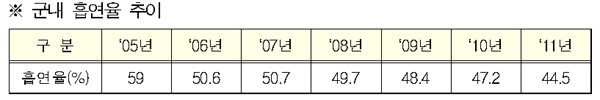 국방부는 “군이 ‘담배를 배우는 곳’에서 ‘담배를 끊는 곳’이 되도록 보건복지부, 한국건강관리협회 등과 협조해 ‘금연희망 및 교육부대’ 운영, 군 금연교육자료 개발, 금연포스터 제작 등을 적극적으로 추진 할 계획”이라고 밝혔다.