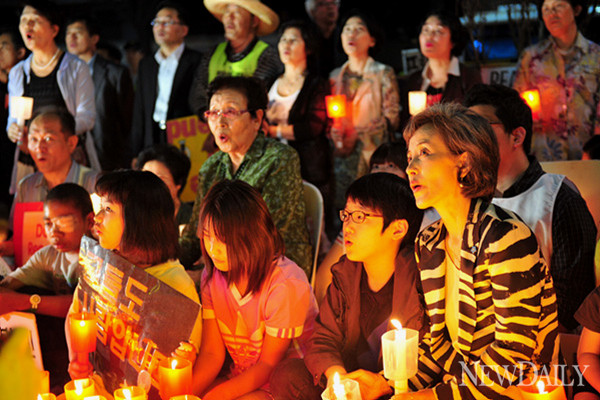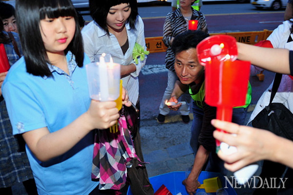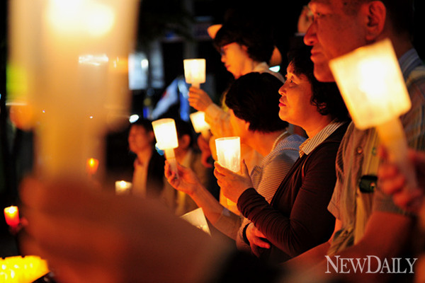 그래서 그런지 이날 교회 앞엔 ‘하나, 둘, 셋, 넷…’ 99개의 촛불이 켜졌다. 종이컵에 불이 자주 붙어 촛불은 사이즈가 큰 플라스틱에 담겼다. 그만큼 집회에 요령이 생긴 것이다.
