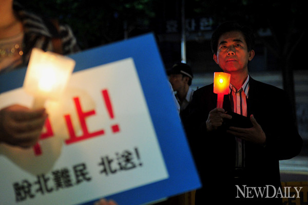 22일 오후 7시30분, 서울 종로구에 위치한 옥인교회(주한 중국대사관 맞은편) 앞에서 열린 ‘탈북자 북송반대집회’ 100일 전야제에서 각지에서 모여든 참석자들이 촛불을 들고 있다.