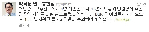 박지원 원내대표는 2일 트위터를 통해 “다양성, 여성, BBK사건 등 여러 문제가 있다. 18대 법사위, 율사 의원들이 논의해 (당의 입장을) 발표하겠다”고 선언했다.