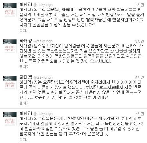 "임수경 의원 사과문 다시 한 번 읽어봤습니다. 그 사과는 거짓 사과입니다. 임 의원은 탈북자들을 변절자라고 몰아세우고는 사과문에서는 그러지 않았다고 거짓말을 합니다. 임 의원은 탈북자들이 왜 변절자인지 누구를 변절했는지 분명히 밝혀야 합니다."