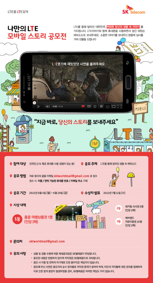 이번 공모전은 LTE서비스를 사용해본 사람이라면 누구라도 참여할 수 있으며 자유로운 형식으로 글을 작성해 이메일(sktworldmail@gmail.com)로 접수하면 된다.