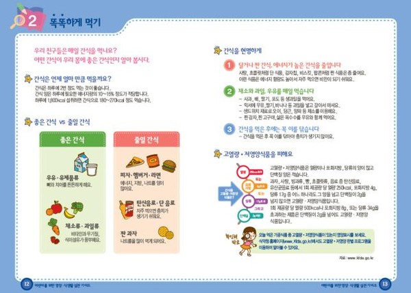 똑똑하게 먹기에서는 어린이들이 즐겨먹는 간식을 좋은 간식과 줄일 간식으로 나눠 현명하게 섭취하는 방법을 제시했다.