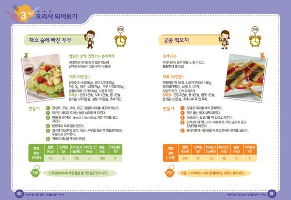 요리사 되어보기에서는 채소 숲에 빠진 두부와 궁중 떡꼬치와 같은 어린이 인기간식의 조리법과 영양정보를 제공한다.