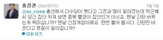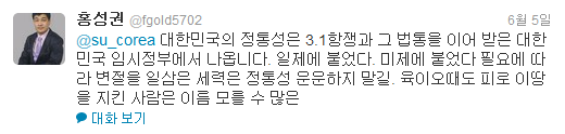 민주통합당 전.현직 보좌관들의 모임인 민동포럼 초대 회장을 지낸 홍성권 전 새시대전략연구소 대외협력위원장은 5일 자신의 트위터에 다음과 같은 글을 남겼다.