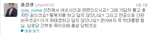 그는 또 새누리당 박근혜 전 비상대책위원장을 겨냥 "선친께서 여순사건과 관련있으시죠? 그때 가담자 불고 혼자만 살았죠? 탈북자들과 닮지 않았나요?"라고도 했다. 앞서 임수경 의원이 탈북자를 '변절자'라고 한 것과도 같은 맥락이다.