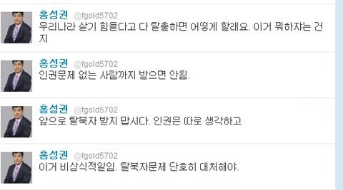 홍 전 대외협력위원장은 앞서 지난 4월에는 국군포로 고(故) 백종규씨의 딸 영옥씨 가족을 비롯해 탈북자 5명이 지난 4월 극비 입국한 것을 두고도 다음과 같은 글을 트위터에 올렸었다.