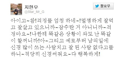 지현우는 지난 11일 자신의 트위터에 "아이고 참! 걱정들 엄청 하네! 멀쩡하게 잘먹고 잘살고 있으니까. 잠수탄 거 아니니까. 걱정마요"란 글을 남겨 일각에서 제기된 '잠적설'을 부인했다.