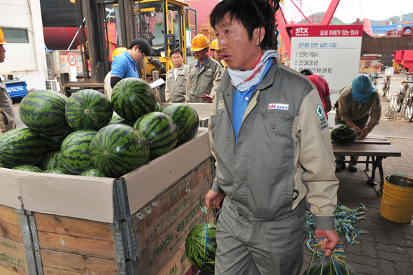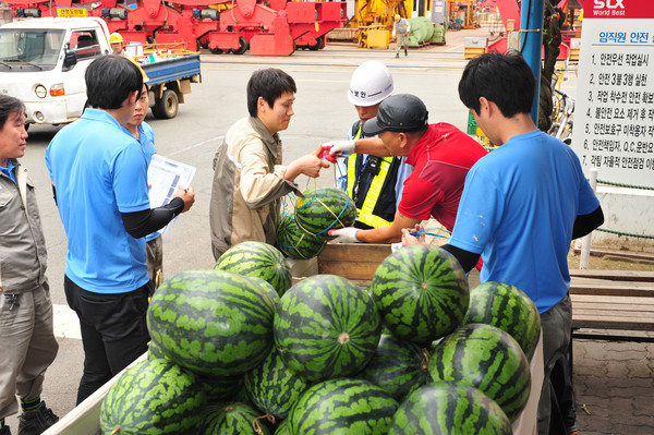 STX조선해양은 더운 환경에서 작업을 해야 하는 작업자들을 위해 6월부터 8월까지 시원한 수박과 미숫가루를 제공한다.