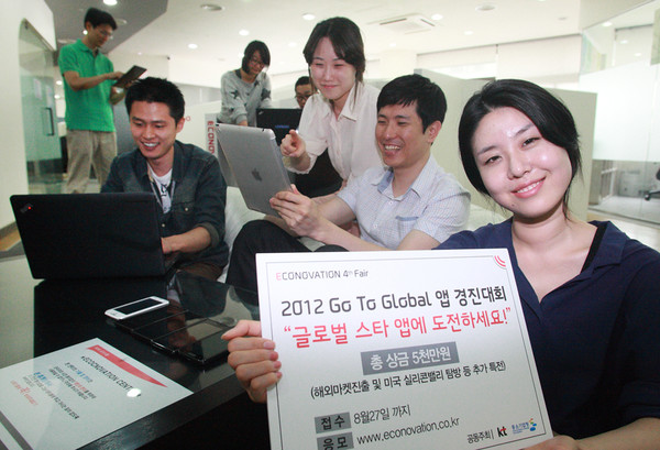 KT와 중소기업청이 손잡고 글로벌 앱 발굴에 나선다. 앱 개발 생태계의 글로벌 경쟁력 향상을 위해 국내 우수 앱의 해외마켓 진출을 지원하는 ‘2012 고 투 글로벌(Go To Global!) 앱 경진대회’를 개최한다고 18일 밝혔다.