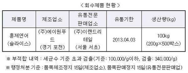 식품의약품안전청은 18일 (주)이랜드리테일(킴스클럽)에서 판매하는 ‘훈제연어(슬라이스)’ 제품이 세균 수 기준을 초과함에 따라 관련 제품을 유통판매 금지 및 회수 조치한다고 밝혔다.