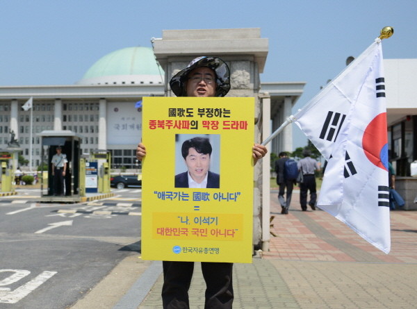 자유총연맹은 "'애국가는 국가가 아니다'라는 통합진보당 이석기 의원의 발언을 비판하고 종북 주사파 의원들의 사퇴를 촉구하려는 목적으로 1인 시위를 마련했다"고 말했다.