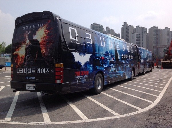 먼저 서울을 비롯한 전국 5개 도시에 영화의 이미지로 버스 전체를 감싼 랩핑버스를 운행한다. 배트맨과 캣우먼, 배트맨과 베인으로 나뉘어 장식된 두 대의 랩핑버스를 비롯해 배트맨, 캣우먼, 베인의 캐릭터가 한 자리에 모인 굴절 랩핑버스 총 세 대의 버스로 영화 홍보에 나선다. 특히 굴절 랩핑버스의 경우, 영화는 물론 일반 제품의 광고 이미지가 전체를 랩핑한 것은 <다크 나이트 라이즈>가 최초의 사례로 <다크 나이트 라이즈>의 역동적인 이미지가 영화의 스케일과 액션에 대한 기대감을 더한다. <다크 나이트 라이즈>의 랩핑버스는 광주, 대구, 대전, 부산에서, 굴절 랩핑버스는 서울 시내 전역을 운행 중이다.