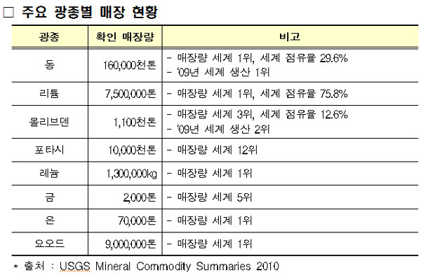 우리나라는 1988년 이후 칠레에서 5개 사업을 벌이면서 2억5,400만 달러를 투자한 바 있다. 지금도 진행 중인 사업은 산토도밍고, 까마로네스의 구리 사업, 엔엑스우노에서 진행하는 리튬 사업이다. 이 중 산토도밍고와 엔엑스우노 사업에는 광물자원공사가 2억1,800만 달러를 투자한 상태다.