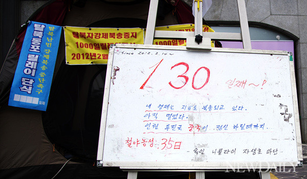 지난 2월 23일부터 집회에 참가한 탈북가수 김충성(36·서울 한샘교회) 씨는 농성장 텐트 안에서 "