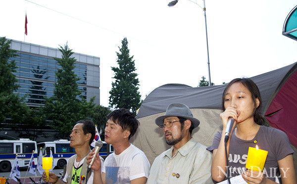 22일 오후에도 서울 효자동 중국대사관 맞은편 옥인교회 앞에서는 '중국의 탈북자 강제북송 중지' 를 촉구하는 집회가 계속됐다. 이날 집회에 참가한 시민들이 북한 인권을 주제로 한 노래 '유리병'을 함께 부르고 있다.