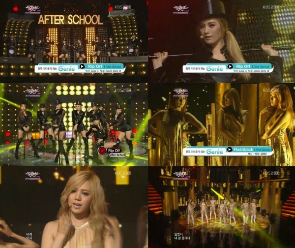 애프터스쿨은 22일, 생방송으로 진행된 KBS 2TV '뮤직뱅크'에서 화려한 지팡이 댄스를 선보이며 ‘Rip Off’ 를 통해 첫 무대를 가졌다. 일본 콘서트에서 첫 선을 보였던 ‘ Rip Off’ 는 멤버 ‘정아’가 작사를 한 것으로 알려져 화제를 모았던 곡.