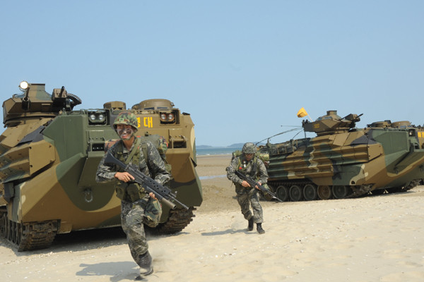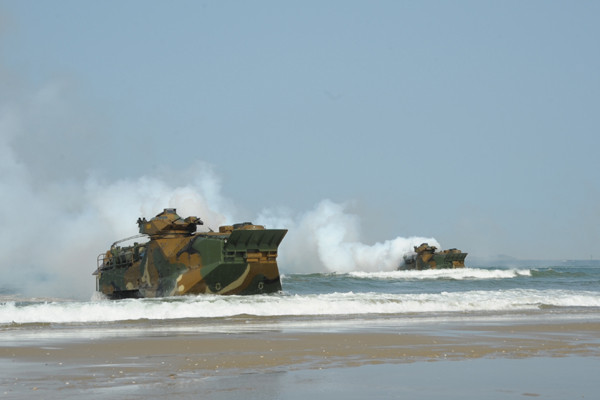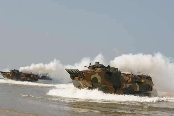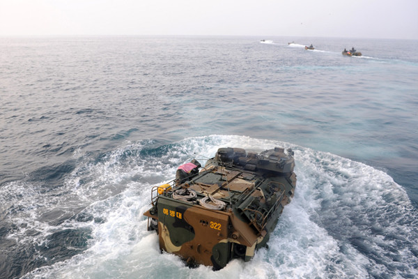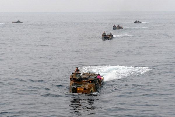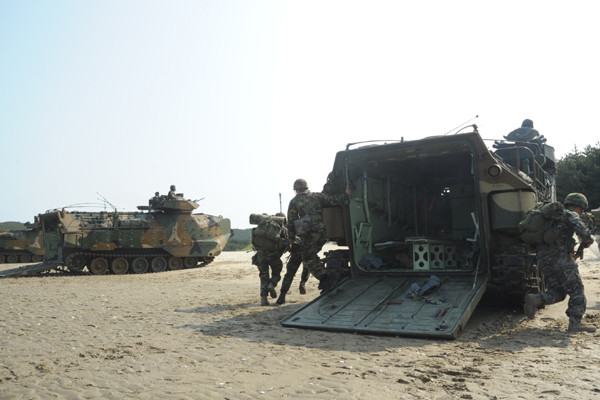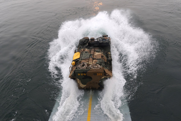 해병대의 상징 '상륙돌격장갑차'가 상륙함에서 발진하고 있다. 상륙돌격장갑차(KAAV-7)는 상륙작전 시 해병대 병력의 손실을 줄이고, 초기에 상륙 해안에 있는 적을 제압하는 데 필수적인 장비다.