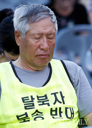 '탈북자 북송 반대'라고 쓰여진 옷을 입은 한 시민이 눈을 감고 기도하고 있다. 이날 대회에는 수백여명의 시민들이 참석해 자리를 빛냈다.