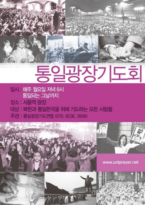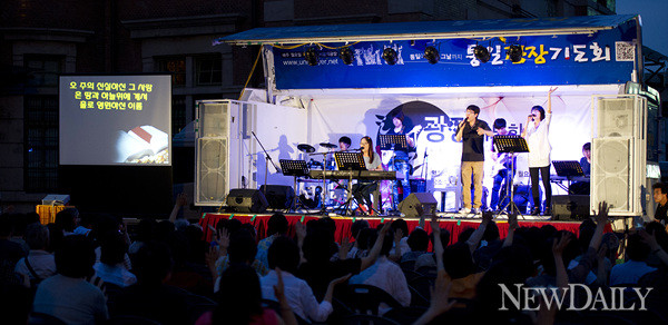 지난해 10월부터 매주 월요일마다 열린 '통일광장기도회' 는 이날 그 목소리가 최고조에 달했다. 한국탈북민교회연합회, 에스더기도운동 등 5개 기독·시민단체로 구성된 '통일광장기도연합' 이 주최한 이 기도회는 독일에 있는 한 교회의 월요기도 모임이 9년 동안 계속돼 베를린 장벽을 허무는 계기가 된 것을 모델로 하고 있다.