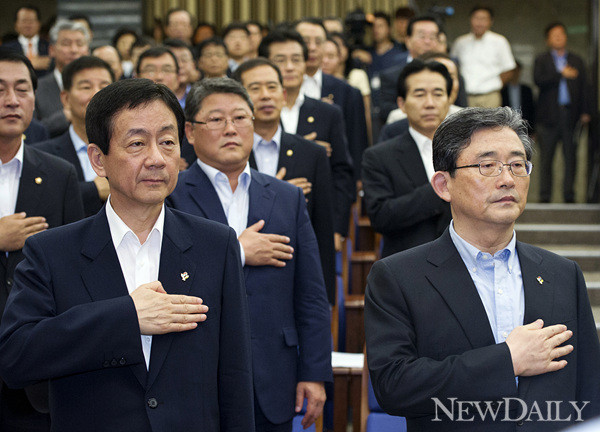 29일 오전 서울 여의도 국회에서 새누리당 이한구 원내대표과 진영 정책위의장이 29일 서울 여의도 국회 회의장에서 열린 '국회의원 겸직금지 관련 의원 총회'에 참석한 가운데 새누리당 의원총회를 가지고 있다.