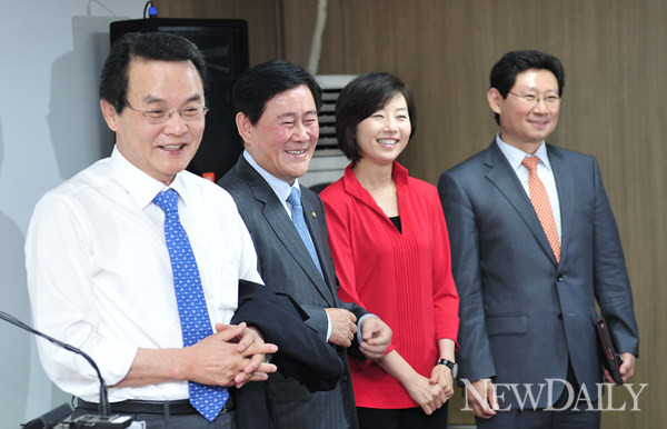 2일 서울 여의도 대하빌딩에서 새누리당 박근혜 전 비상대책위원장의 경선 캠프가 문을 열었다. 이날 오후 공동선대위원장을 맡은 홍사덕 전 의원(왼쪽)이 기자실을 방문해 약식 간담회를 갖고 있다. 왼쪽 두번째는 캠프 실무총책을 맡은 최경환 의원. 경선캠프 대변인에는 조윤선 전 의원(왼쪽 세번째)과 이상일 의원이 각각 내정됐다.
