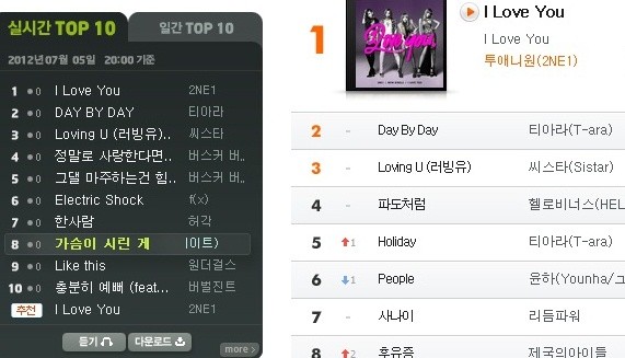 2NE1의 신곡 '아이 러브 유(I LOVE YOU)'는 5일 오후 8시 현재 멜론, 벅스 뮤직, 소리바다 등 주요 음원 사이트를 '올킬'하며 성공적인 출발을 알렸다.