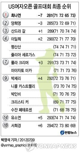 한국여자골프의 에이스 최나연(25·SK텔레콤)은 9일(한국시간) 미국 위스콘신주 콜러의 블랙울프런 골프장(파72·6천954야드)에서 열린 제67회 US여자오픈 챔피언십 골프대회에서 최종합계 7언더파 281타로 챔피언 자리에 올랐다. zeroground@yna.co.kr @yonhap_graphics(트위터)최나연은 11번홀(파4)에서 두 번째 샷을 홀 1.5m에 붙여 가볍게 버디를 낚은 데 이어 12번홀(파4)에서는 깊은 러프에서 빠져나와 5m 거리에서 천금 같은 파 퍼트를 성공시켰다.