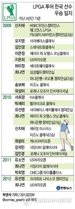 한국 선수들은 이번 시즌 열린 미국여자프로골프(LPGA) 3개 메이저대회 중 크라프트 나비스코 챔피언십(유선영 우승)과 US여자오픈 등 2개 대회의 우승컵을 가져왔다.
