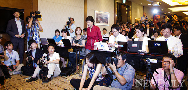 출정식에서 대선출마를 선언한 박근혜 전 위원장이 메리어트호텔에서 열린 기자회견에 참석하는 모습.