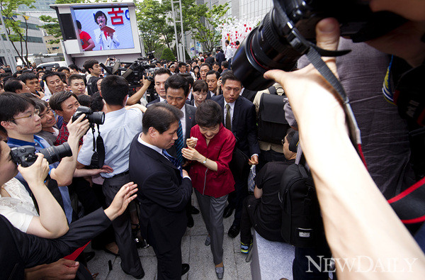 타임스퀘어 광장에 도착한 박근혜 전 위원장이 경호원들의 보호를 받으며 연단으로 걸어가는 모습.