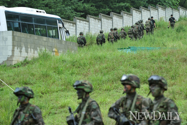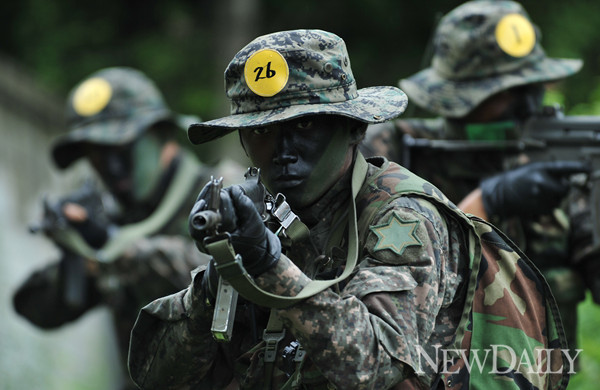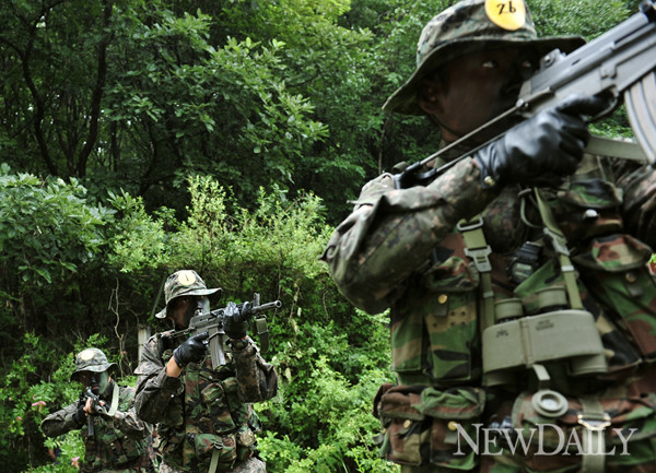 11일 오전 경기도 광주소재 특전교육단에서 ‘특공·수색병 1기‘ 훈련병들의 훈련이 공개됐다. ‘특공·수색병 1기’ 훈련병들은 특공·수색 정예화 일환으로 지난 3월 첫 모집을 시작하여 5주간의 기초군사훈련을 마치고 현재 특전교육단에서 3주간의 특공·수색교육을 받고 있다. 이들은 후방지역작전을 전담하는 수색 및 특공부대에 전원 배치될 예정이다.