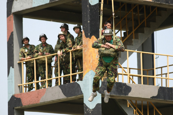 한 여성 참가자가 '막타워'에서 뛰어 내리고 있다. 보기와는 달리 뛰어 내리는 게 결코 쉽지 않다. 실제 훈련을 가르친 사람들은 남자보다 여자들이 오히려 더 잘 뛰어내리는 편이라고 전하기도 한다.