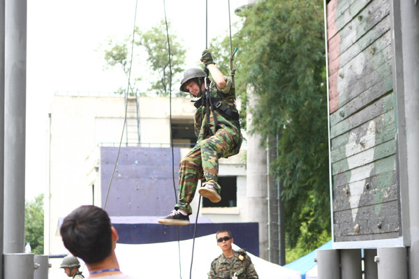 이번에는 헬기 레펠 지상훈련. 군대 다녀온 사람이라면 대부분 레펠 훈련을 받아봤으리라. 하지만 다른 나라에서 온 청소년들은 이런 훈련을 평생 받아볼 일이 없다.