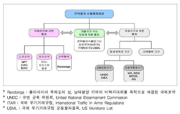 현재 우리나라는 핵확산금지조약, 화학무기금지협약 등 국제조약과 함께 바세나르체제, 호주그룹 등 국제기구를 통한 전략물자수출통제 체제에 동참하고 있다.