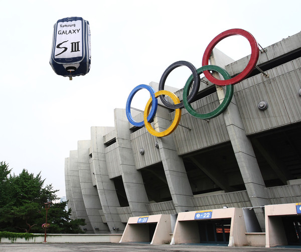 삼성전자가 런던올림픽에 출전하는 국가대표 선수들의 선전을 기원하기 위해 잠실종합운동장 주변 탄천 자동차극장에 국내 최대 크기의 초대형 ‘갤럭시S3’를 띄웠다.