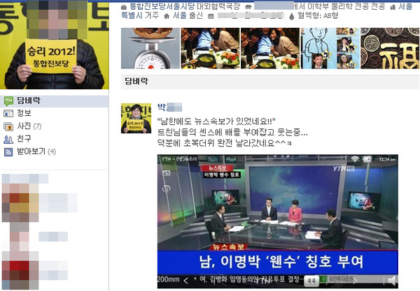 이 와중에 통합진보당 서울시당 대외협력국장이라는 박 모씨가 자신의 페이스북에 올린 사진이다. 북한 중대발표 소식을 전하는 뉴스 화면을 캡쳐해 이 대통령을 비하하는 것으로 편집했다. 트위터 팔로어가 제작한 것으로 보이는 이 사진을 올리면서 박 씨는 이렇게 말했다.