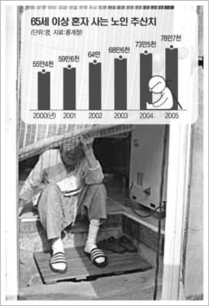 독거노인 가구는 가구주 연령이 65세 이상인 1인 가구를 말한다. 통계청에 따르면 지난 2005년 77만 6,996에서 2010년 105만 5,650가구로 증가했다. 이 가운데 남성이 21만 4,389가구, 여성이 84만 1,261가구다.