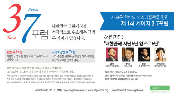'세이지3_7포럼 창립좌담회'가 오는 25일 오후 7시 서울 종로에 있는 한국교회 100주년기념회관에서 개최된다.