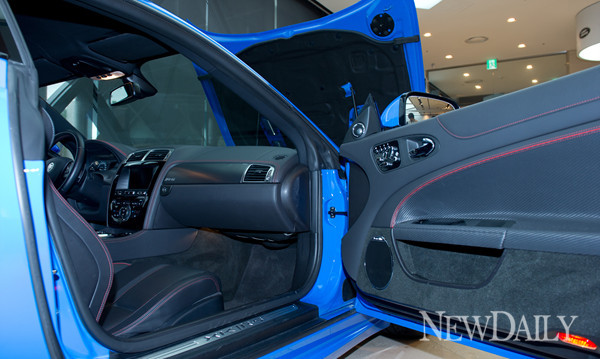 XKR-S는 실내도 가죽과 카본파이버로 장식돼 있다. 도어에 붙은 시트 조절장치는 메모리 기능과 함께 버킷시트의 날개 조절 등 16방향으로 조정이 가능하다. 좌석에 실제 앉아보면 무척 편안하다. 시야도 괜찮은 편이다. 솔직히 포르쉐보다는 좋았다.
