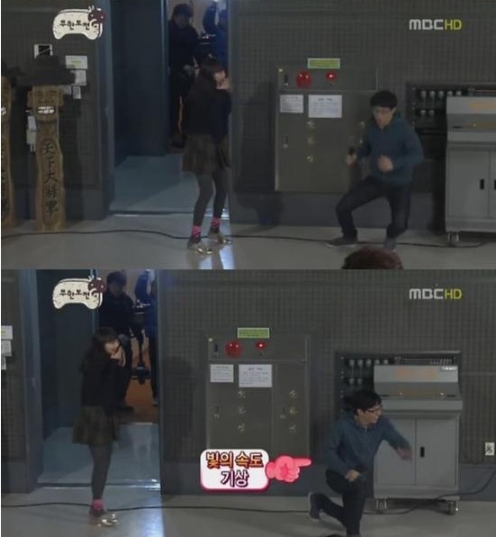 문을 통해 들어오던 이나영과 마주한 유재석은 너무 놀란 나머지 넘어지고 말았다.