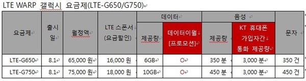 - 손희남 상무(KT 프로덕트기획담당)‘LTE-G650요금’은 데이터 6GB, 음성통화 350분, 문자 350건을, ‘LTE-G750요금’은 데이터 10GB, 음성통화 450분, 문자 450건을 기본 제공한다.