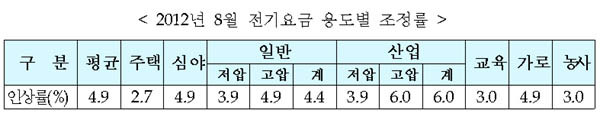 지경부가 인가한 전기요금 인상안을 살펴보면 대기업이나 대형 빌딩이 주로 사용하는 산업용 고압요금은 6% 인상한다. 중소기업과 영세상인이 사용하는 산업용․일반용 저압 요금은 3.9% 인상하고, 주택용 요금은 2.7%, 교육용 요금은 3% 인상한다.
