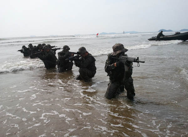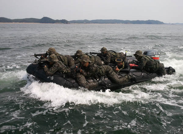 다음엔 먼 바다에서 고무보트를 이용한 해상침투 시범을 선보였다. 거센 파도를 뚫고 고속침투를 통해 해안접안에 성공한 특전용사들은 적진에 은밀히 침투해 목표를 타격하는 등 특수작전을 능수능란하게 완수했다.