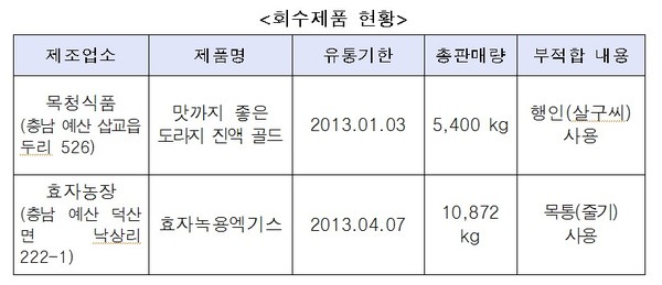 충남 예산 삽교읍 두리 소재 ‘목청식품’은 식품에 사용할 수 없는 살구씨를 사용해 ‘맛까지 좋은 도라지 진액 골드’를 제조했다.